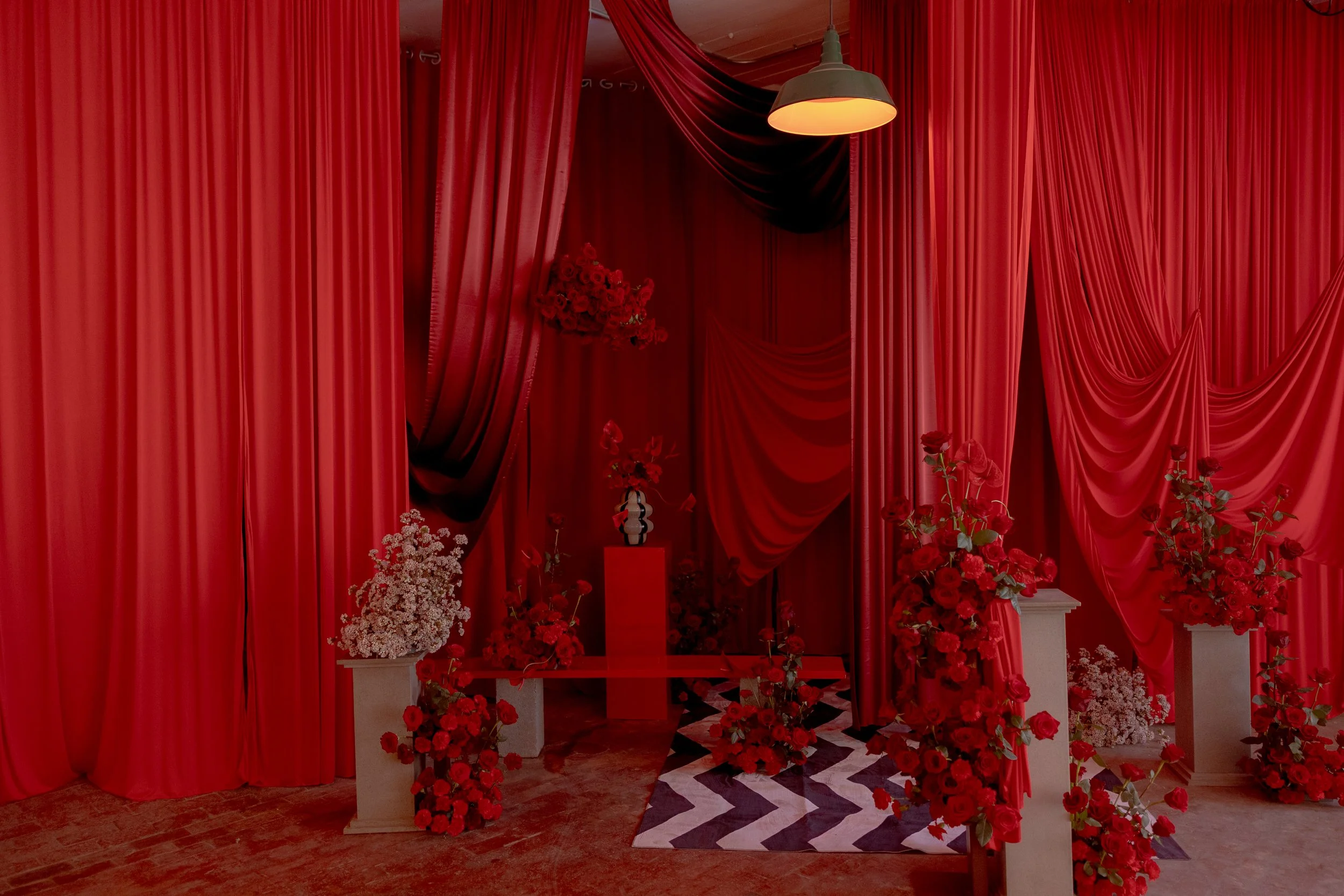 Created for Valentine’s Day, this installation plunged into the fevered intensity of love and its capacity to possess, to consume, to disorient. Inspired by the charged stillness of the red room imagined by David Lynch, the space was drenched in crimson with heavy draping and saturated florals, creating a landscape without beginning or end, a place where you could get lost completely.